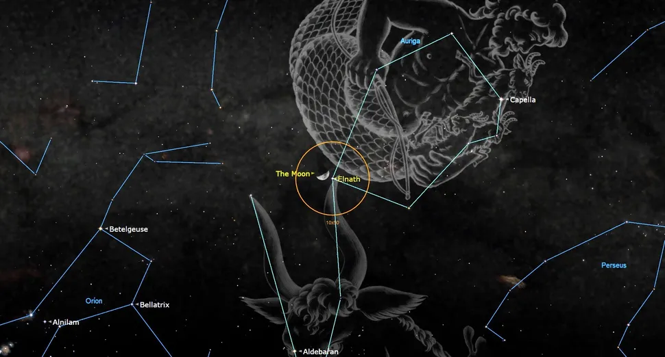 High in the western sky after dusk on Tuesday evening, March 24, the half-illuminated moon will shine very close to the bright star Elnath, which marks the northern horn tip of Taurus, the Bull and is also part of the ring-shaped constellation of Auriga, the Charioteer. During the night, the moon's steady eastward orbital motion around the Earth, by about its own diameter every hour, will carry it past the star. Observers located in a zone extending eastward across northeastern South America can use binoculars (orange circle) and backyard telescopes to watch the moon occult Elnath. Exact timings will vary by location, so use an app like Starry Night to determine the precise times where you live. In Georgetown, Guyana, the dark leading edge of the moon will cover Elnath at 6:50 p.m. Guyana Time, which converts to 22:50 GMT for other time zones. The star will emerge from behind the moon's opposite, bright limb near Mare Crisium at 8:14 p.m. GYT. For best results, start watching a few minutes ahead of each time noted.
