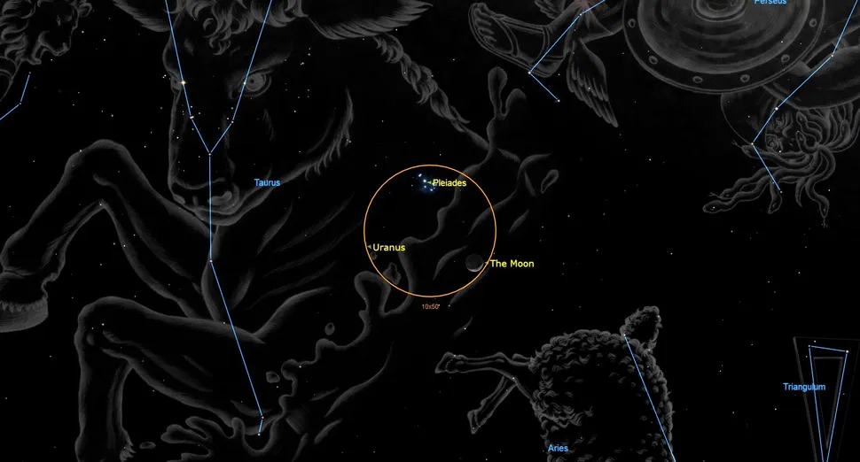 The pretty, waxing crescent moon will shine halfway up the western sky after dusk on Sunday, March 22. If you place the moon at the bottom edge of the field of view of binoculars (orange circle), the bright Pleiades Star Cluster, aka Messier 45, Subaru, and the Seven Sisters will be arrayed near the top of the field. The cluster, which resembles a miniature dipper, will also appear to your unaided eyes. You might glimpse the blue-green speck of Uranus positioned off to their left. Those viewing the scene later, and in more westerly time zones, will see the moon closer to the cluster. The group will drop into the trees around 11 pm local time. Hours later, skywatchers located in the region surrounding Japan will see the moon skim through the northern edge of the cluster.